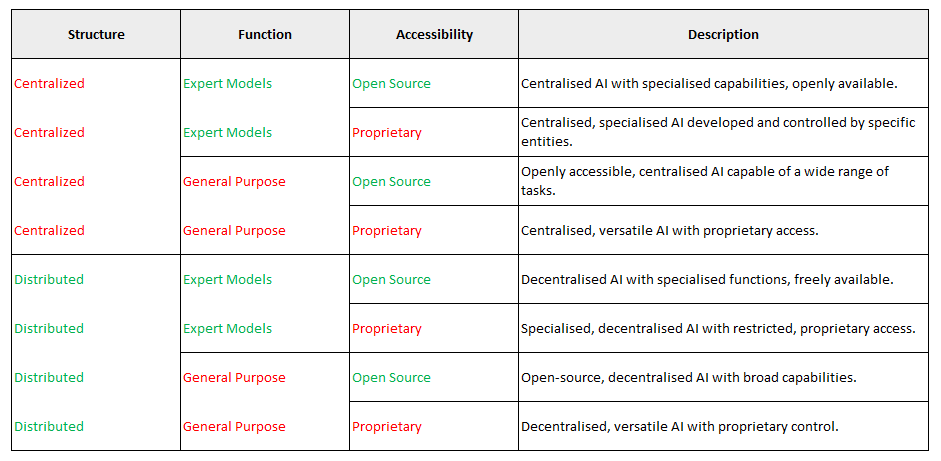 Exploring the future of artificial intelligence through its potential configurations reveals a complex landscape shaped by three critical dimensions: the structure of AI systems (centralised vs. distributed), their functional design (expert models vs. general purpose models), and their mode of distribution (open source vs. proprietary). These dimensions intersect to create eight distinct possibilities for AI’s evolution, each with unique implications for technology, society, and governance.